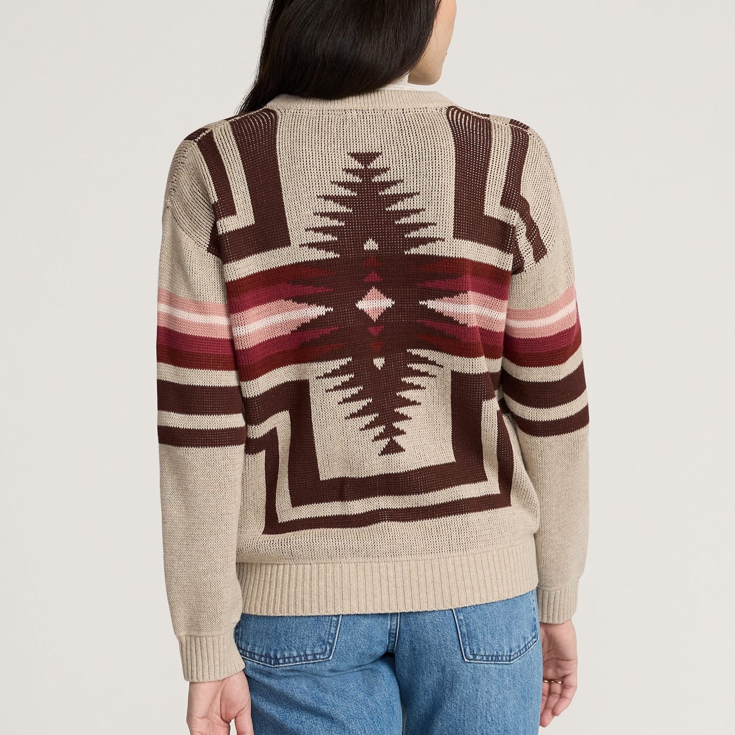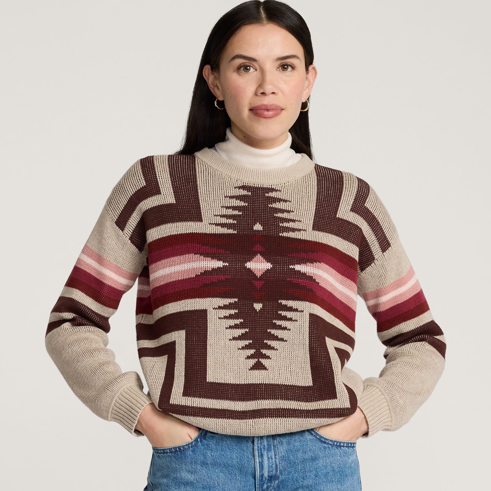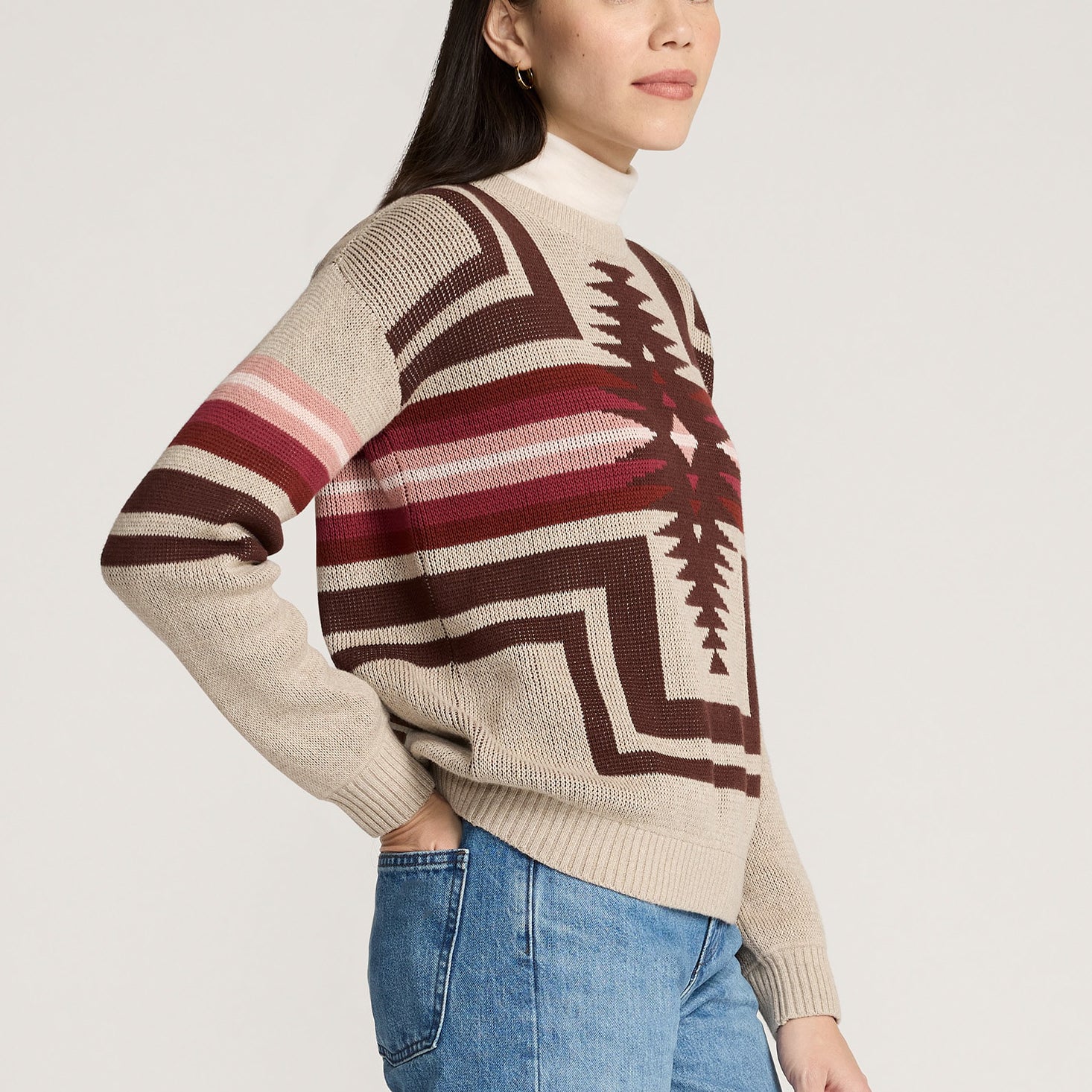A soft cotton sweater with a placed jacquard pattern on front, back and sleeves. Features include a crew neckline, dropped shoulders, long sleeves and ribbed finishes. Lightweight enough for transitional wear.
