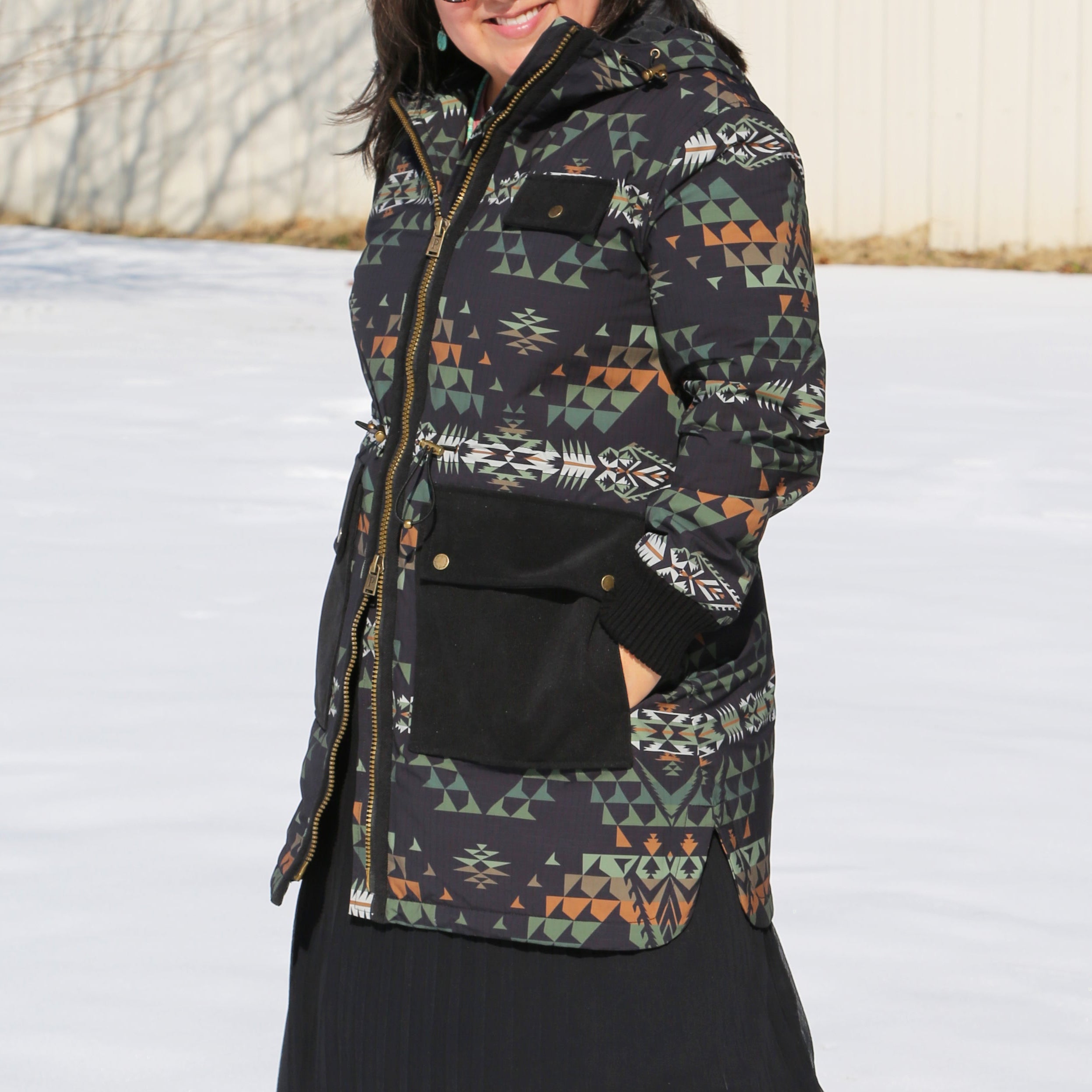 Two-tone women's anorak crafted from durable patterned ripstop fabric with a polyester fill, designed to deliver lightweight warmth and long-lasting wear. Thoughtful corduroy trim accents the center front, chest pocket flap, and lower double entry patch pockets, adding both texture and heritage style. Features include a two-way zip front for versatile wear, adjustable drawcord waist for a custom fit, protective layback hood, chunky knit cuffs to seal out the chill, and a flattering shirttail hem. Perfect for layering through changing seasons, whether in the city or on the trail.